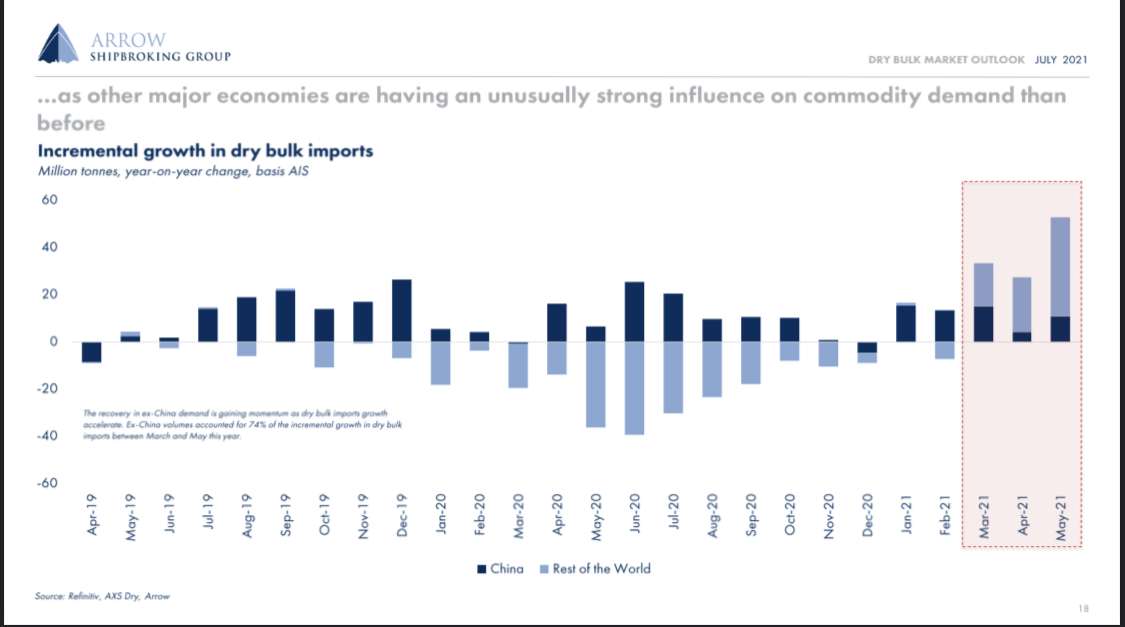 To that extent, it is easy to understand why dry bulk owners expect a bright future for the next 12-18 months. Seaborne trade has reached new record highs, surpassing even the 2019 previous peak. Although the rate of increase will naturally moderate from here as comparisons become less favorable (i.e. demand growth normalizes following the very weak levels of 2020), growth should remain stronger versus the pre-pandemic trend, aided mainly by minor bulks and coal. And this time around it is not only China. The rest of the world is thirsty for commodities and that is aiding shipping at its core. As the chart below shows, it is regions ex-China that is now the driving force behind commodity prices and shipping rates alike.