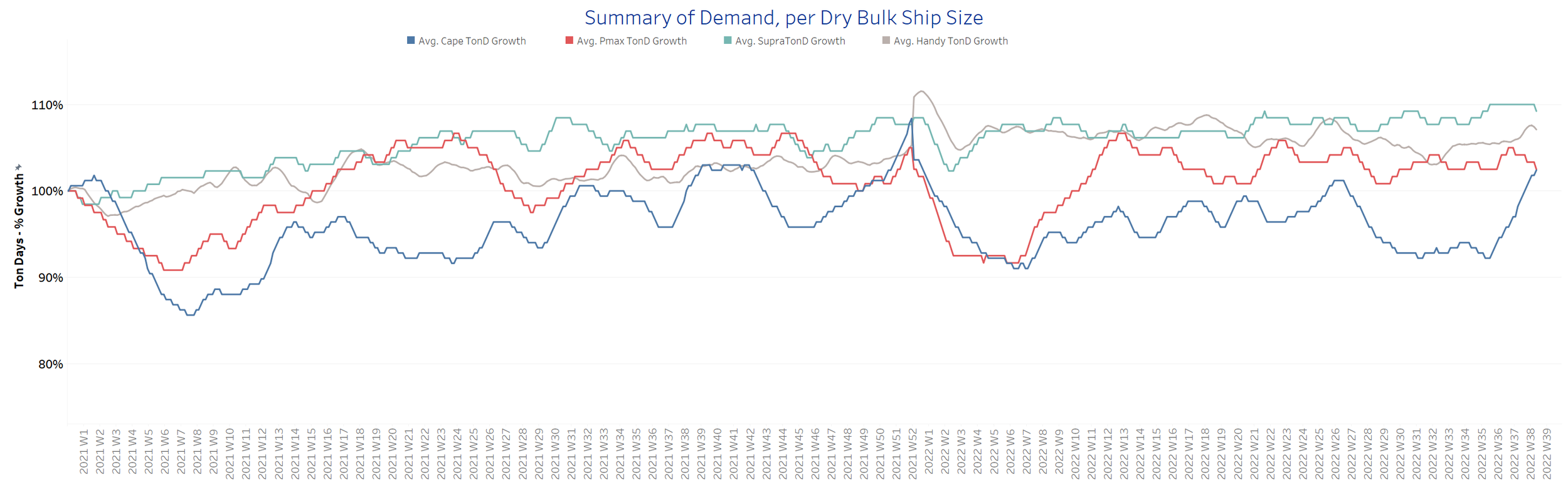 Supramax demand ton-days: The percentage increase remains stable, with some downward correction observed towards the end of September.