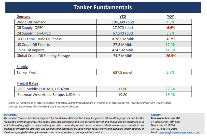 • Tanker cycle driven by tight supply, recovering demand – The tanker market is recovering from a long period of staggered rates as the growth in new vessel supply shrinks while oil demand is recovering in line with the global economy. A historically low orderbook combined with favorable demand fundamentals should continue to support increased spot rate volatility, which combined with the ongoing geopolitical turmoil, should support freight rates in the medium term.