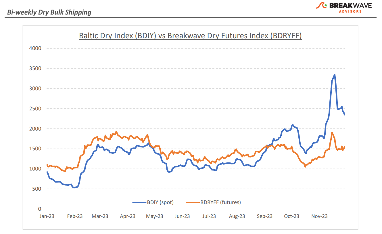 • White Christmas in China brings holiday joy for Capesize owners – Surprise Christmas gifts are the best and Capesize owners are getting a big one this year. A confluence of events in the past month begun with a surge in rates in the Atlantic on tight vessel availability and has now been followed by a very cold weather front in North China that is causing delays and tightening vessel availability in the Pacific region. The result is a spot Capesize market that so far has failed to correct the way that the freight futures market has been dictating and the strength is now threatening to expand during a period that activity tends to calm down as the Christmas holidays rapidly approach. With few trading days left before the New Year and a highly backwardated curve (spot in the 30,000s /January futures at ~20,000) the risk of the stubbornly strong market spilling into 2024 is becoming real. Although the longer-term futures market has also moved up in the past few weeks, we still believe the current strength is a result of a “perfect storm” situation rather than a change in fundamentals, and although the positive “carry” in the curve is enormously tempting, any vacuum on current demand flow can rapidly bring spot rates down well below the level the futures curve is indicating. In the meantime, investors should cherish the current robustness that once again demonstrates the impressive uncorrelated returns one can achieve in shipping, especially in freight futures, that purely rely on the idiosyncratic and regional nature of supply and demand. HAPPY NEW YEAR!