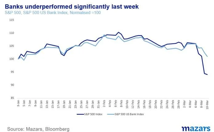 The US experienced the second biggest bank failure in its history on Friday, when $209bn worth Silicon Valley Bank failed and was taken over by the regulator. Equities fell sharply, especially bank stocks, as investors run towards bonds for safety. In times like these it’s not difficult to attract a following shouting “Lehman”. After all, SVB’s Chief Administrative Officer was Lehman’s CFO (you can’t make this up…).