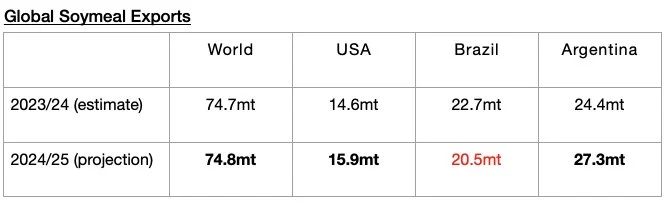 Soymeal exports in 2024/25 are now expected to total 74.8 million tons, which is the same amount that was predicted a month ago and would mark a year-on-year increase of 100,000 tons. An increase in exports is expected from the United States and Argentina. A decline is still expected from Brazil.