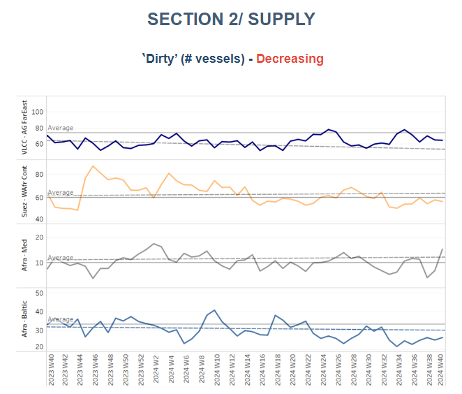 The supply of crude tankers continued its downward trend in early October, although there was a notable upward movement for the Aframax Mediterranean route.