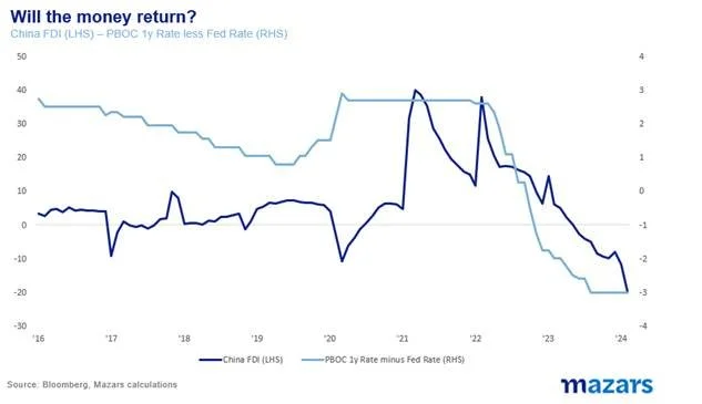 But neither the BoE nor the ECB can lower rates too much, even if they have room to, as long as the Fed holds its rates “higher for longer” for fear of significant capital outflows. Just look at what happened to Chinese FDI, when the rate differential between the Fed and the PBoC grew too big.