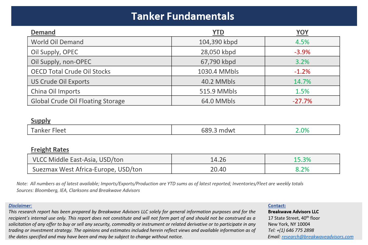 · Crude oil inventories drop and US economic data remains robust, supporting oil prices – Despite a rather uninspiring price action, the fundamentals for oil remain strong. Recent inventory data in the US has revealed a surprising crude oil draw, the result of a combination of bad weather that affected refinery operations, lower production, and lower imports. The impact on the geopolitical turmoil in the Middle East has so far had a muted impact on oil prices as key production regions and important oil trade routes have remained unaffected. Although demand for transportation fuels in the US seems weak, Chinese demand remains robust while the recent stimulus efforts by the Chinese government should begin to gradually affect the broader economy in a positive manner during the next several months. We continue to expect a rangebound market for oil prices, similar to the range over the past six months, with geopolitics providing for the sudden stronger bid and weak economic data bringing back the doom and gloom element for prices. Finally, the new increases in Atlantic basin production and the associated oil export ambitions should continue to support crude tanker rates as longer sailing distances are a positive development for a tanker market that is already tight in new vessel supply.