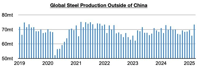 Global steel production totaled approximately 166.1 million tons in March. This is up month-on-month by 21.4 million tons (25%) and is up year-on-year by 4.9 million tons (3%). Steel production outside of China totaled approximately 73.3 million tons.